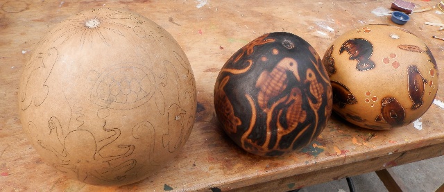 3. Podle čar se do dýní vyřezávají, vypalují(!) a barví vzory.